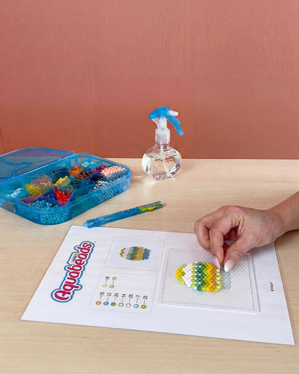 - Når mønsteret er lagt, spray vand på, og lad perlerne tørre.
