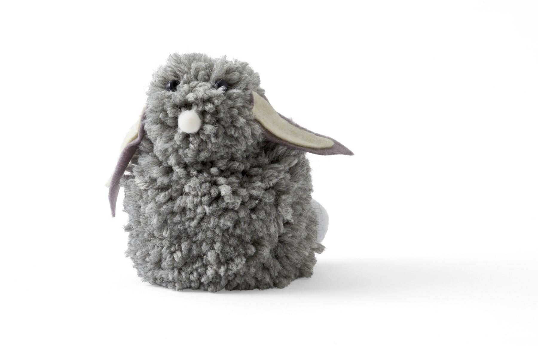 Klip ører ud i filt og lim dem fast på hovedet. Lim to perler fast som øjne og brug pomponer som næse og hale.
