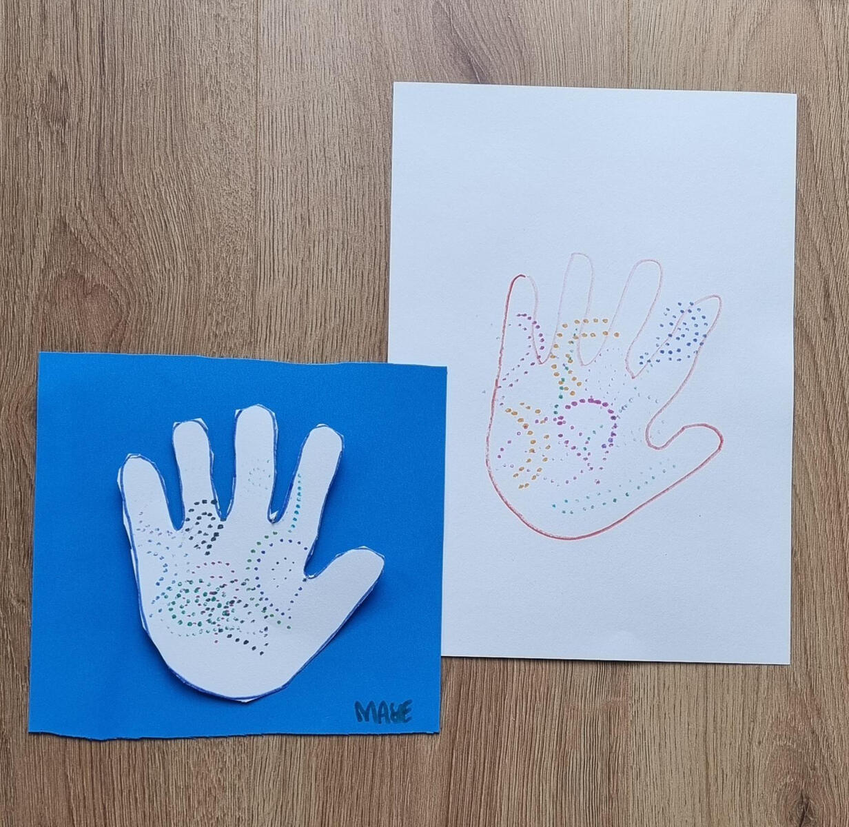 - Træn finmotorikken både ved at tegne rundt om hånden, følge mønsteret fra køkkenrullen og klippe papirhånden ud.