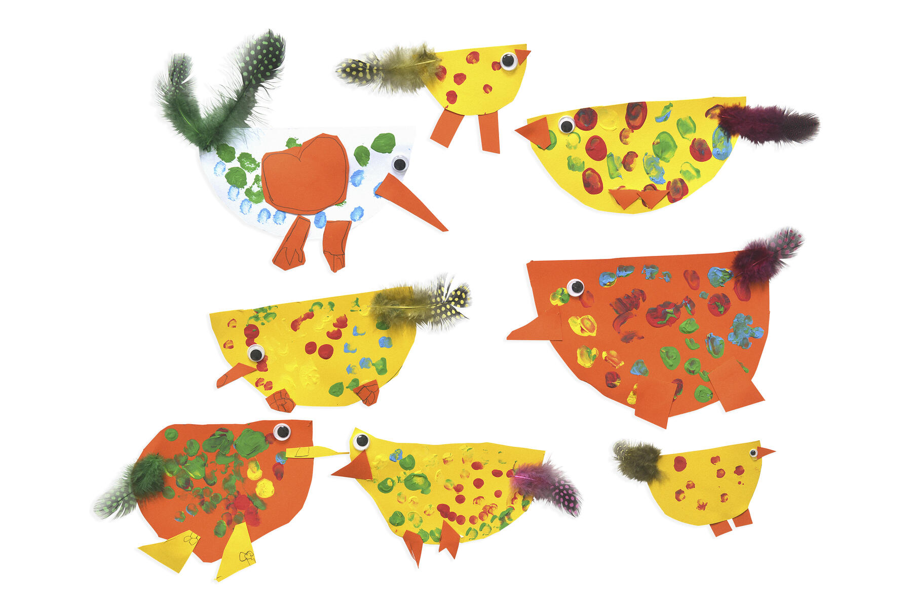 Klip en halvcirkel ud. Dekorer kroppen med fingermaling og fingeraftryk. Klip ud og lim næb, fødder og vinger af pap på. Lim øjne på. Pynt med fjer på bagsiden af kyllingen. Hæng alle kyllingerne på væggen eller i et vindue.