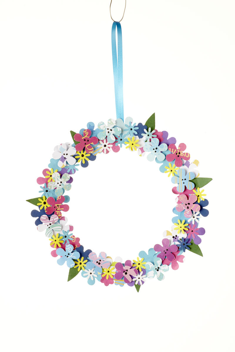 Lim først bladene fast på ringen, så de stikker en smule ud. Lim blomsterne forskudt med hinanden.