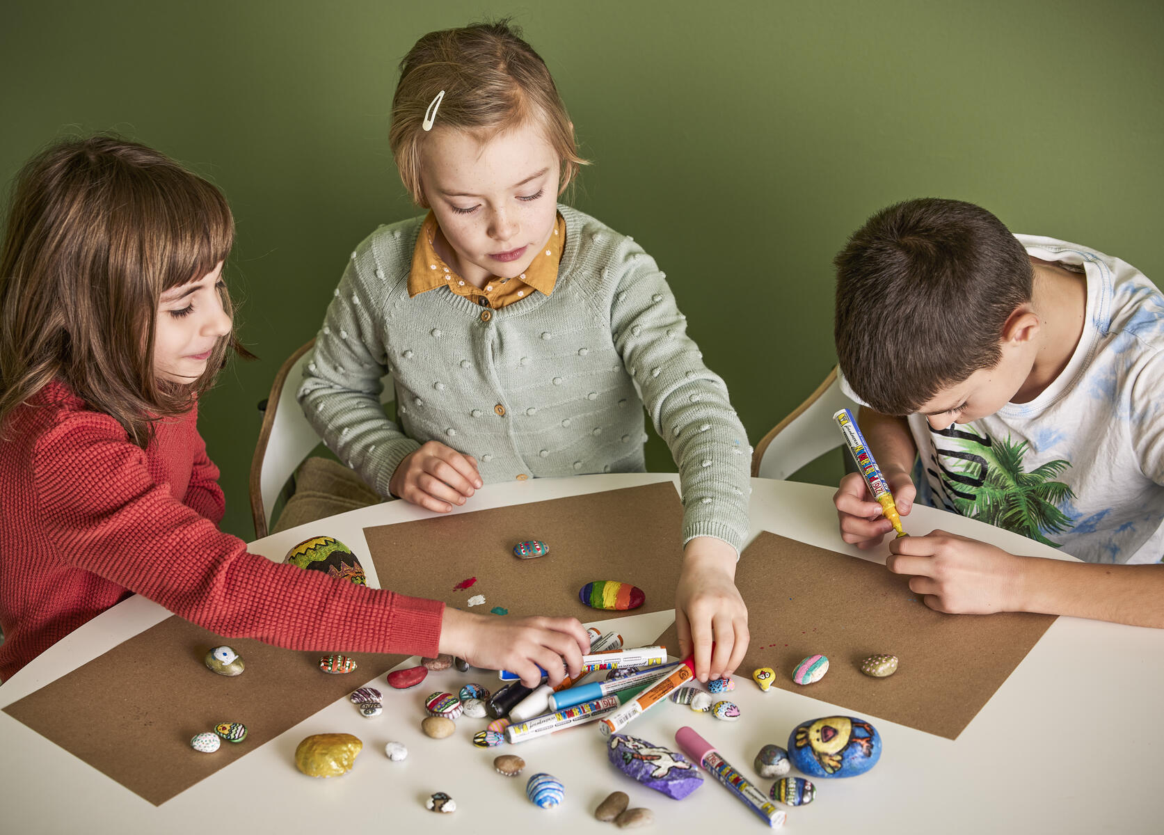 Grund gerne stenene med en dækkende hobbymaling. Når dækmalingen er tørret, kan de dekoreres med maling eller dekorationspenne. Lad tørre.