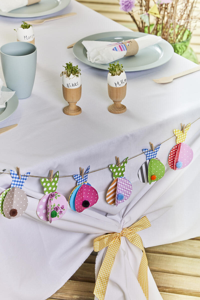 Børnene laver hver en eller flere påskeharer, som bliver sat sammen til en guirlande af farverige harer. Klip 3 eller flere runde cirkler ud, fold alle undtagen den nederste på midten. Klip et hoved ud til haren ved hjælp af en skabelon