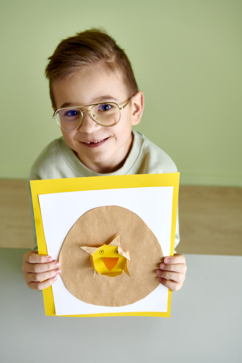 - Klip et næb ud af orange papir (en firkant, der foldes diagonalt), og lim næbbet på den gule "kylling".