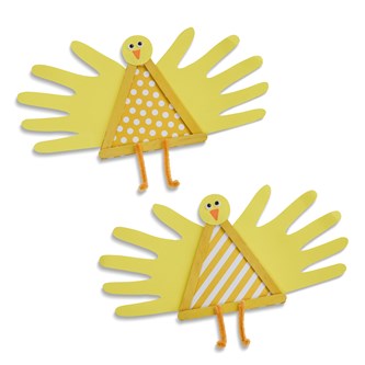 - Fold dekorationspapir dobbelt, tegn rundt om din hånd og klip ud. Lim vingerne på bagsiden af trekanten.