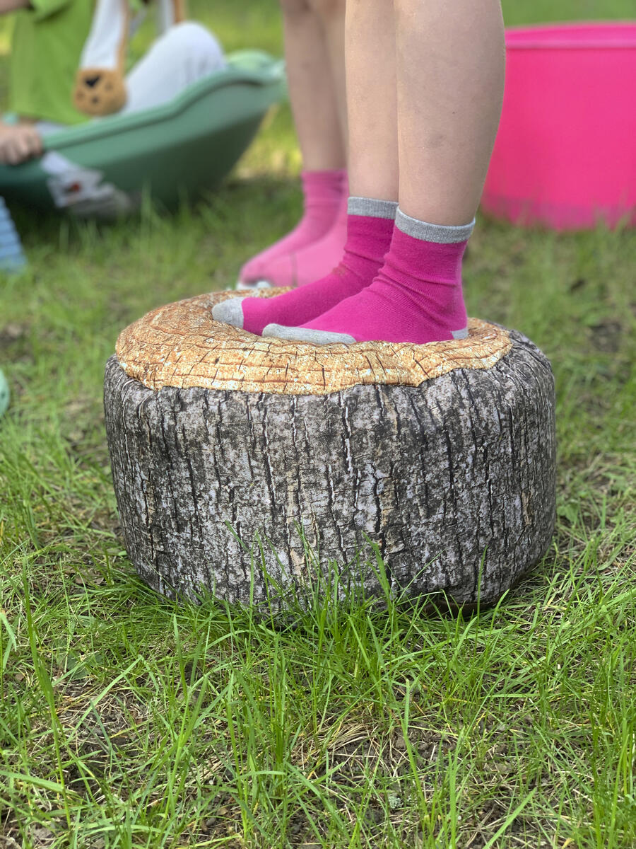 Lav en bane af f.eks. Gonge River Stones, en tumleskal og træstubbe-siddepuffer. Find et blødt underlag, f.eks. noget græs. Børnene skal have bare fødder eller blot strømpesokker på.