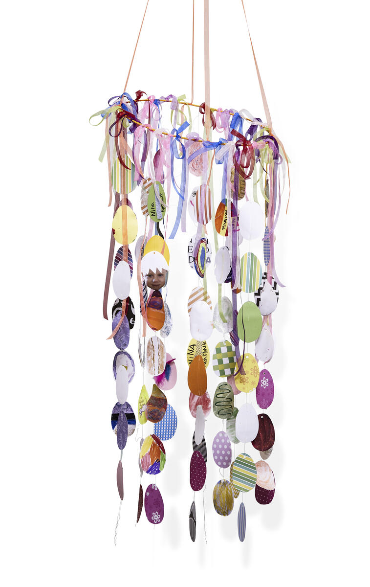 - For at gøre uroen mere personlig kan man klippe billeder af børnene ud. Lim en æggehat på billederne, og hæng dem op i metalringen.