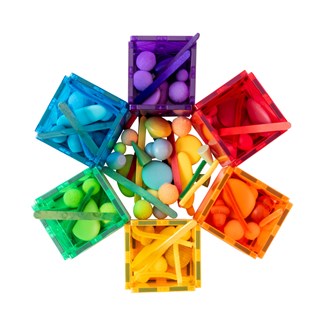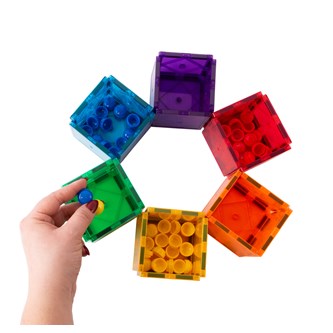 - Lad børnene sortere f.eks. regneknapper (varenr. 75086) ved at putte to primærfarver i den rigtige kube i en sekundærfarve, f.eks. en gul og en blå knap i den grønne kube.