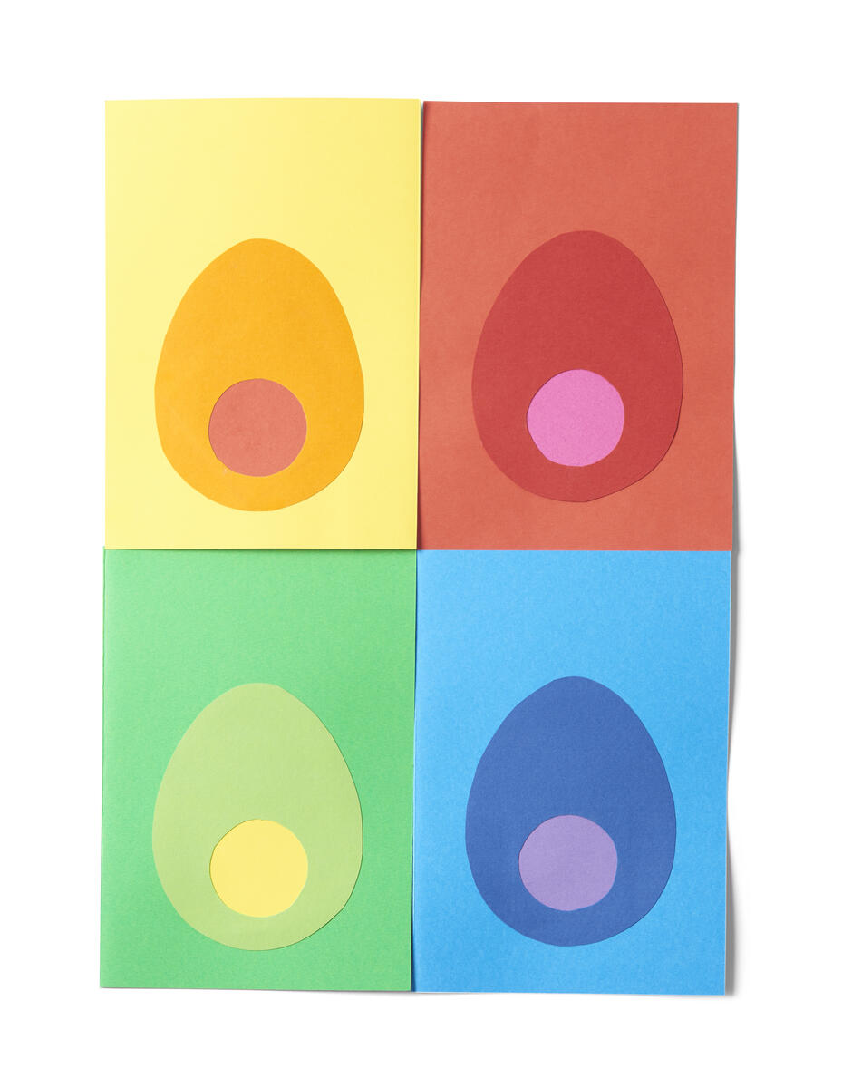 Brug alle nuancerne med tonet papir på nær sort, hvid grå og beige-brun. Anbring alle farverne sammen i en løs farvecirkel. Vælg tre nuancer, der ligger ved siden af hinanden, f.eks. citrongul, gul og orange. Lad nuancerne ligge i farvecirklens rækkefølge. Klip en A5 af den første eller sidste nuance. Klip en form (ægget) ud af mellemnuancen. Klip en mindre form ud af resterende nuance. Lim alle former sammen. Sammenlign, hvordan disse kombinationer opfattes i forhold til kontrasterne i komplementærfarverne.