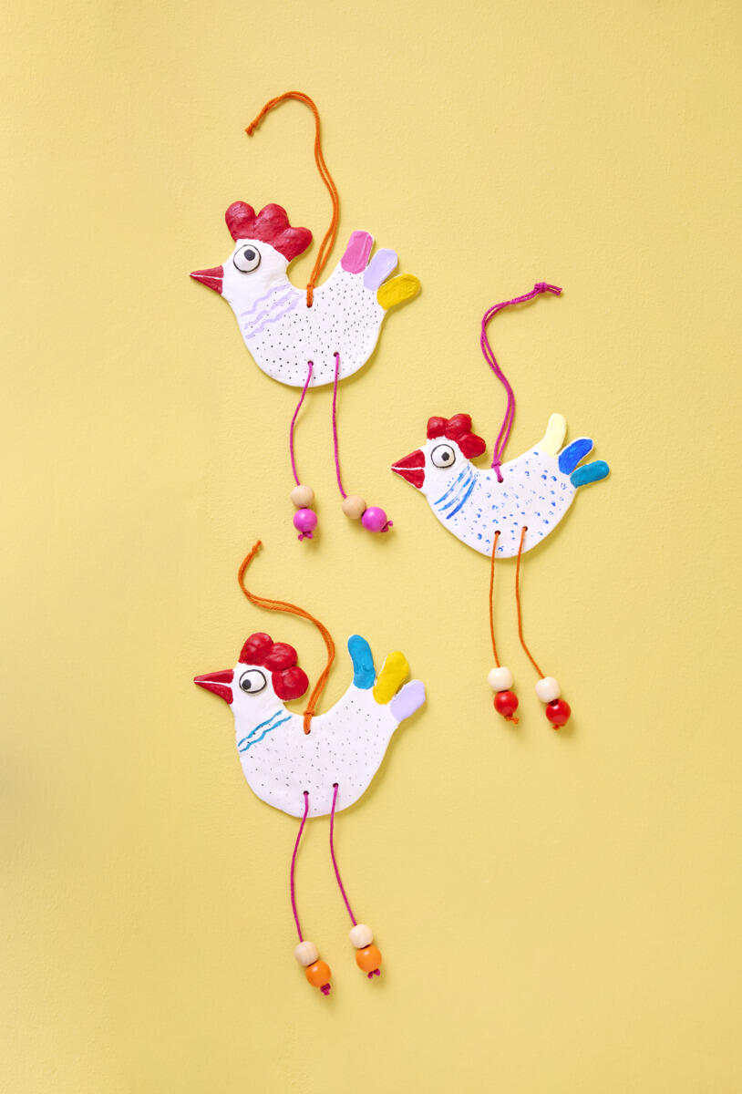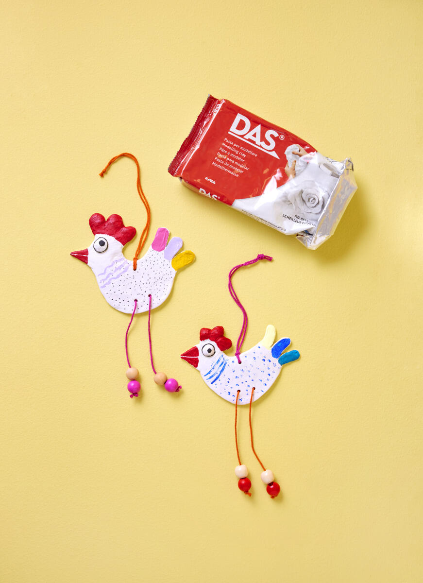 1. Form en figur i lufttørrende ler. Lav huller til ophæng og ben. Lad den tørre.