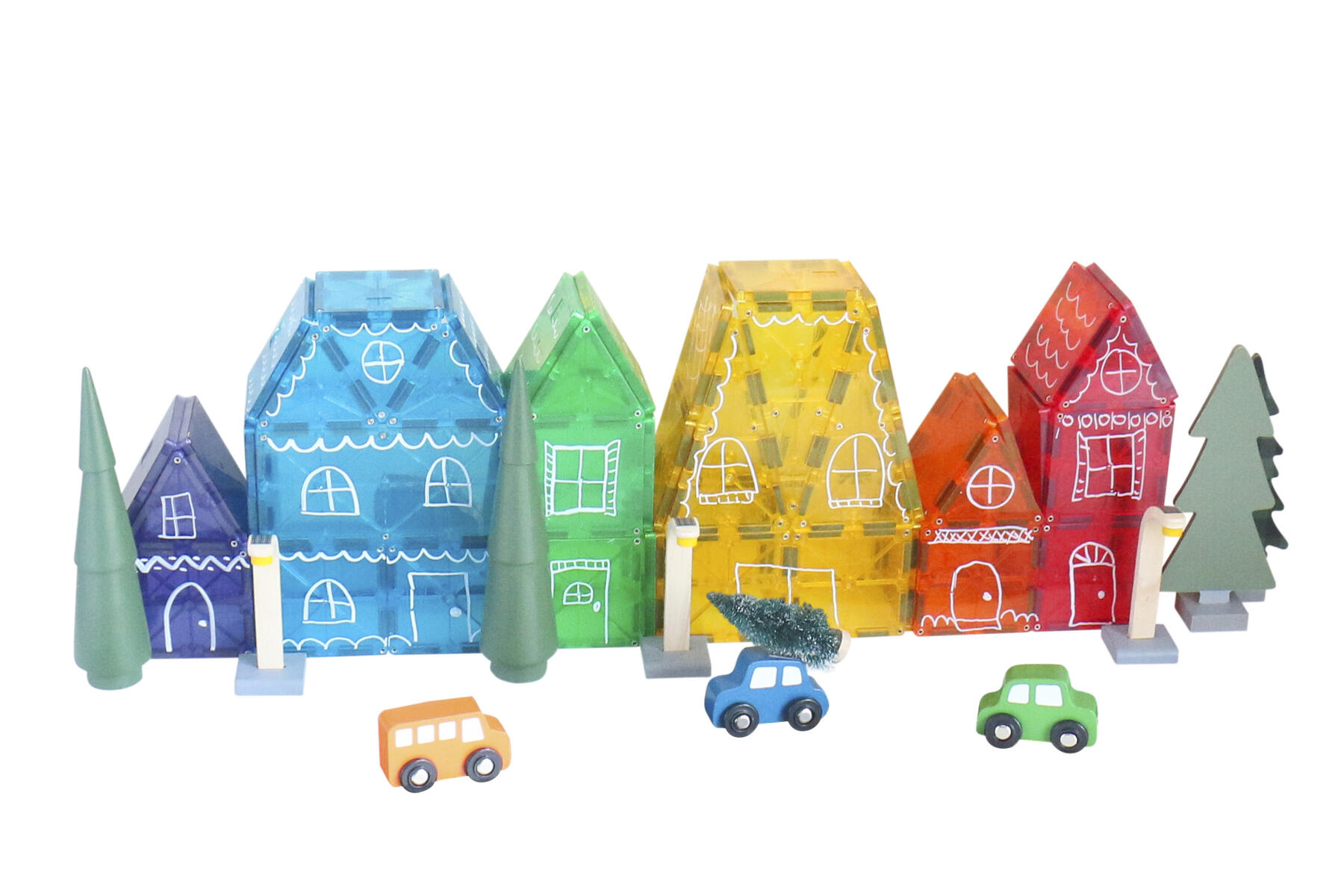 Lad børnene bygge deres eget fantasifule hus med Magna-Tiles, og lav en by med alle husene. Tegn vinduer og døre på husene. Giv byen liv med biler og tilbehør.