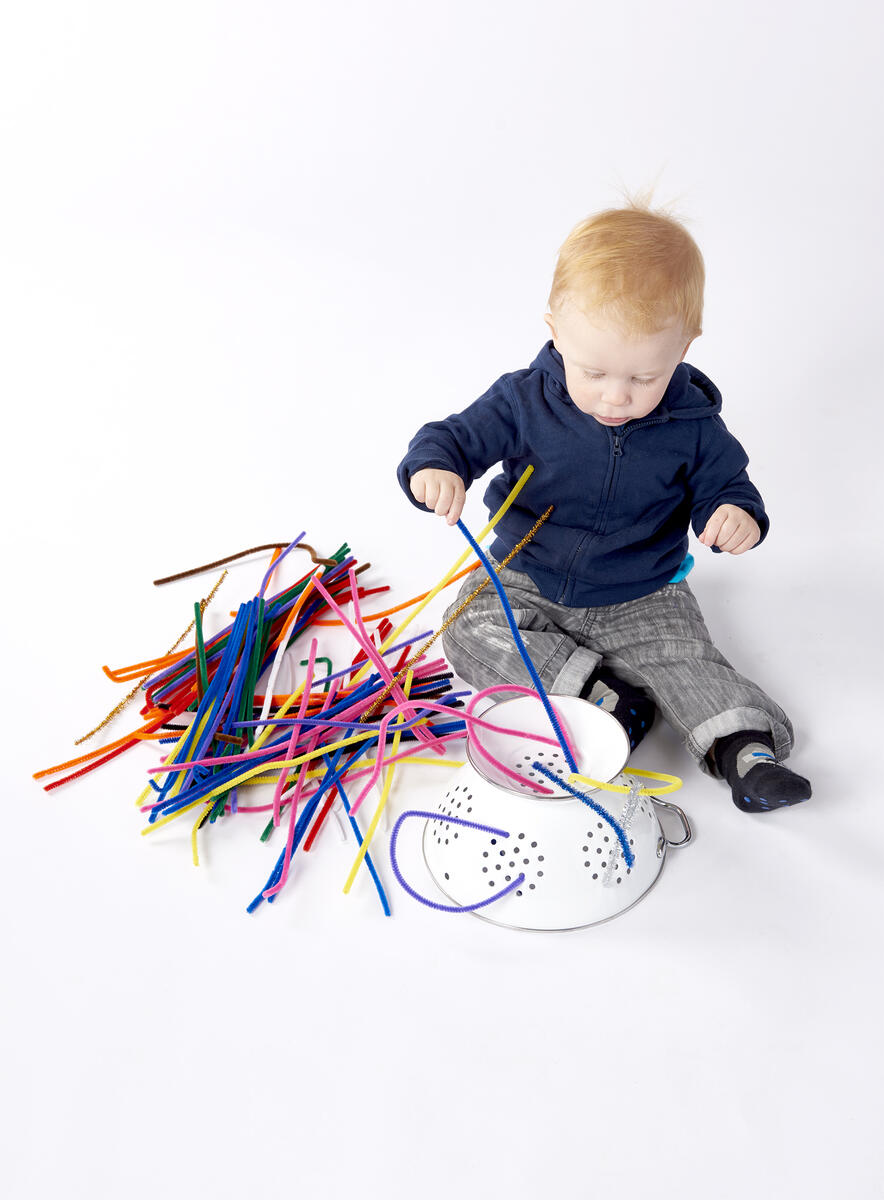 Med et dørslag som base kan børnene lave et herligt kunstværk med piberensere i forskellige farver.