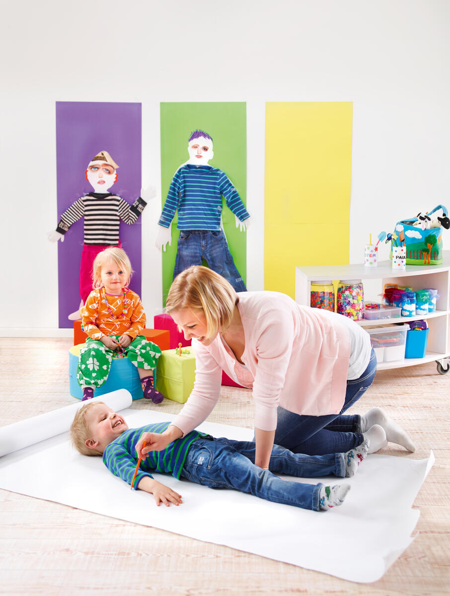 Brug tegnerullen. Bed barnet ligge sig på papiret.