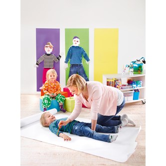 Tegn skabelonen af barnet på tegnepapir på rulle. Klip det ud og hæng op på væggen, gerne med farvet papir som baggrund. Lad børnen klippe forskellige dele fra blade til ansigtet.