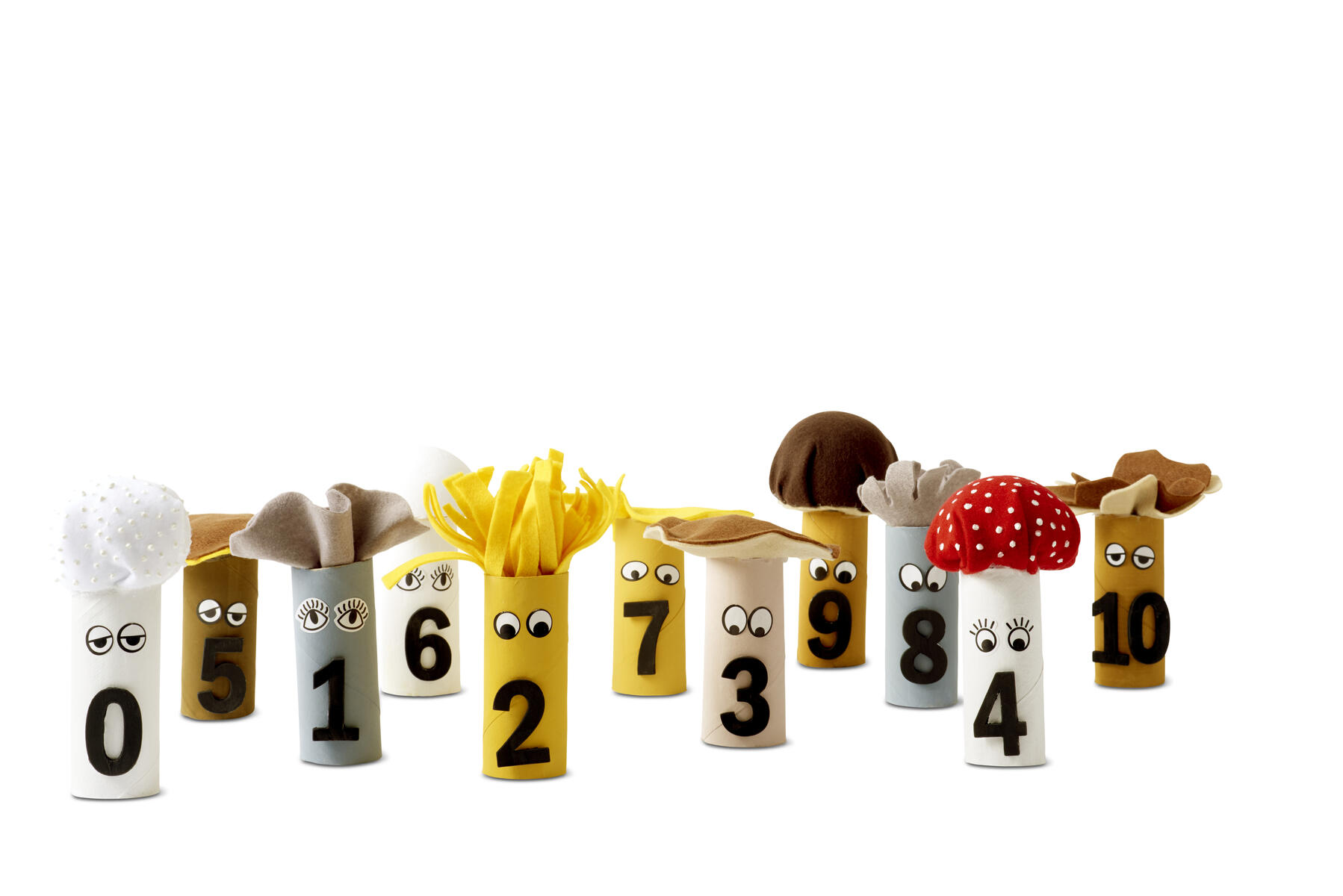 Klip svampehattene ud i filt og lim dem fast på paprullen.