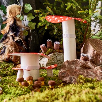 De større fluesvampe er lavet ud af papruller og paptallerkner.