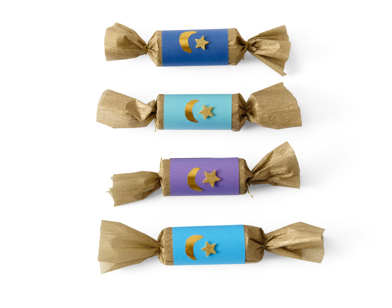 Sæt en klistermærkestjerne på og klip en måne ud i metalkarton, som du også sætter fast på gaverullen.